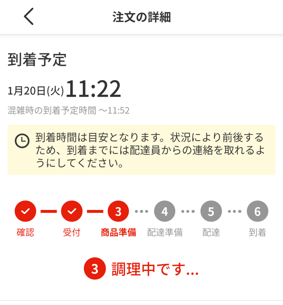 注文完了後、到着時間の目安や、準備の状況がアプリに表示されます。